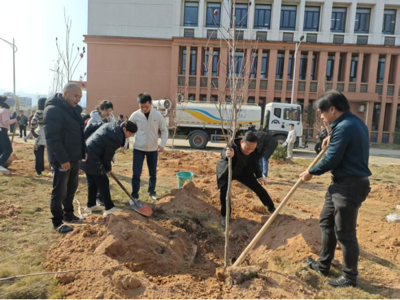 活动现场,支部党员们热情高涨、分工协作,严格按照 “三埋两踩一提苗” 的栽植规范,挥锹挖坑、扶苗定植、培土压实、提水浇灌,每一道工序都认真细致、一丝不苟。大家相互配合、干劲十足,在春日阳光下挥洒汗水,以实干展现党员先锋本色,以协作凝聚支部战斗合力。经过共同努力,一株株树苗整齐挺立、扎根沃土,为校园增添了盎然生机与绿色希望。